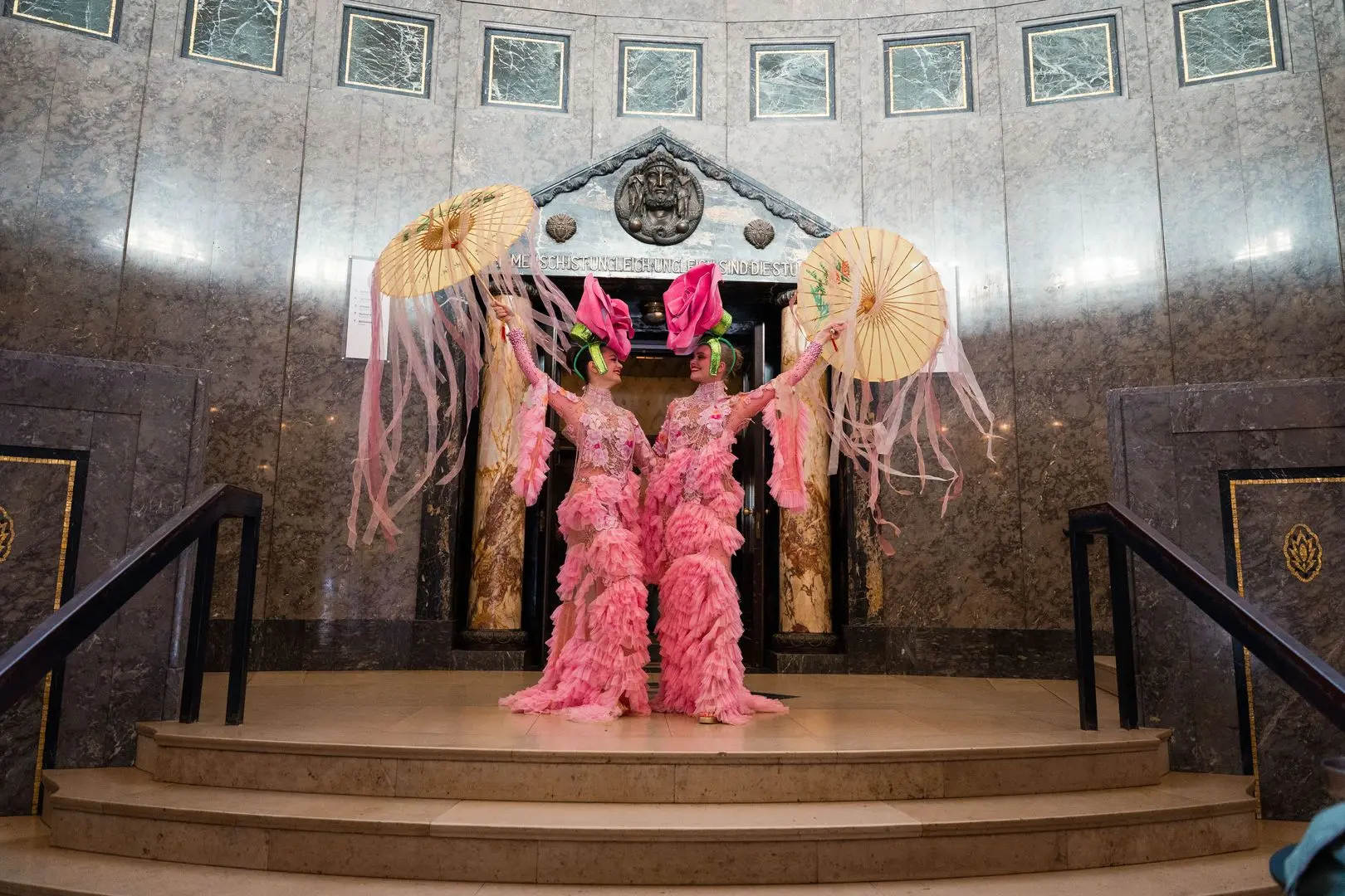 Der Abend begann mit einem Empfang im großzügigen Foyer: Live-Musik, individuell kreierte Welcome-Drinks und mehrere stimmungsvolle Fotospots sorgten für einen glamourösen Einstieg. Der frühere Kassenbereich wurde zur verspiegelten Bühne umgestaltet und diente fortan als Ort für die Ansprachen des Abends.
